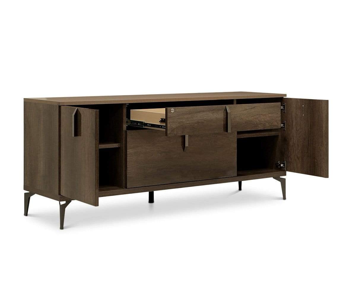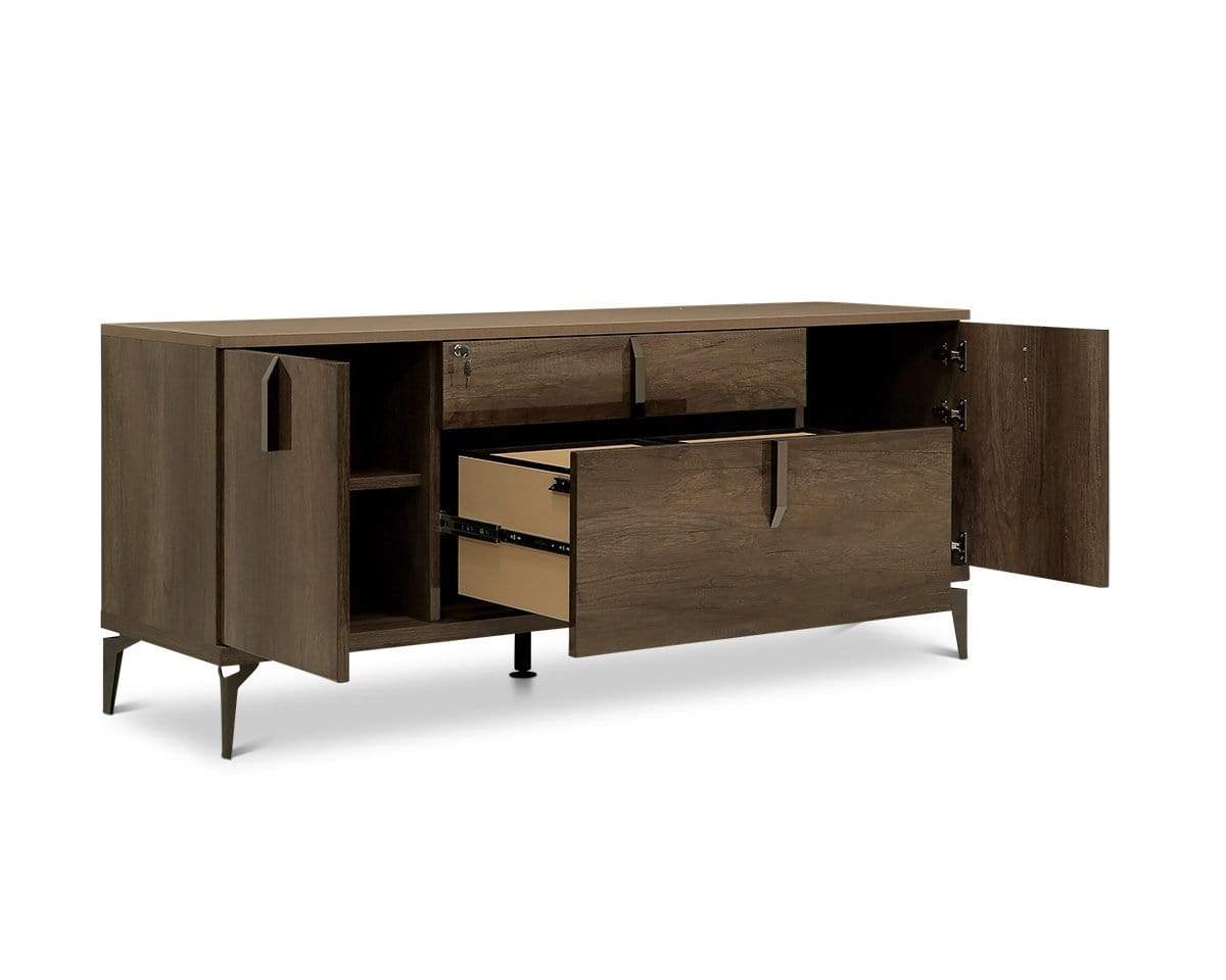 Give your new office space a touch of luxe with an organic feel. The Akana credenza is finished with a high gloss that highlights the wood grain gorgeously. Smoky chrome hardware completes the contemporary aesthetic. A variety of storage options help you organize, including two spacious drawers and two cabinets with four shelves.