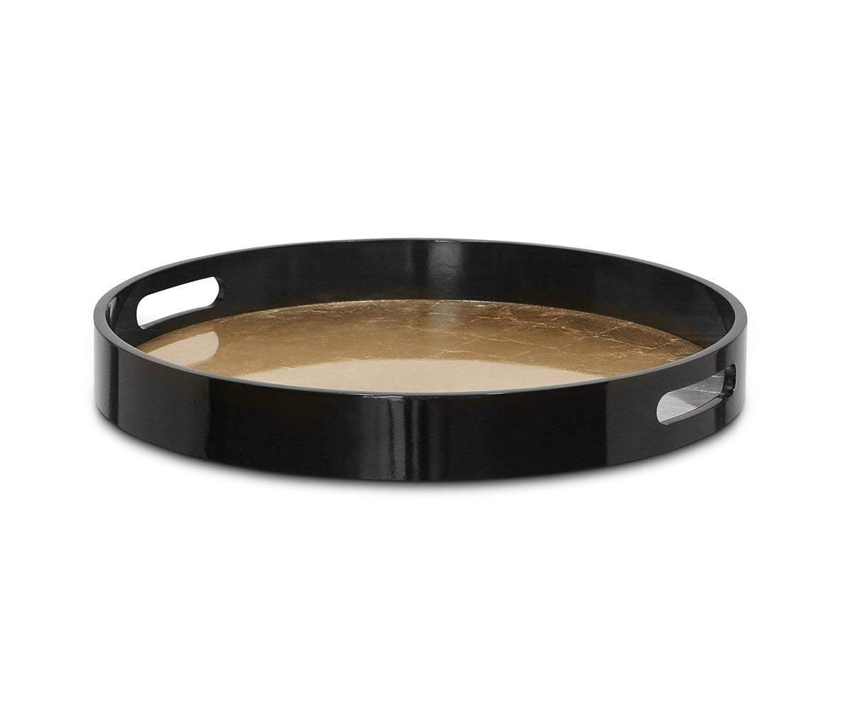 A classic accessory with a posh makeover, the Arnes round serving tray features a wooden construction with high-gloss lacquer finish and a coordinating leafed bottom. The large circular design includes built-in handles for serving ease.