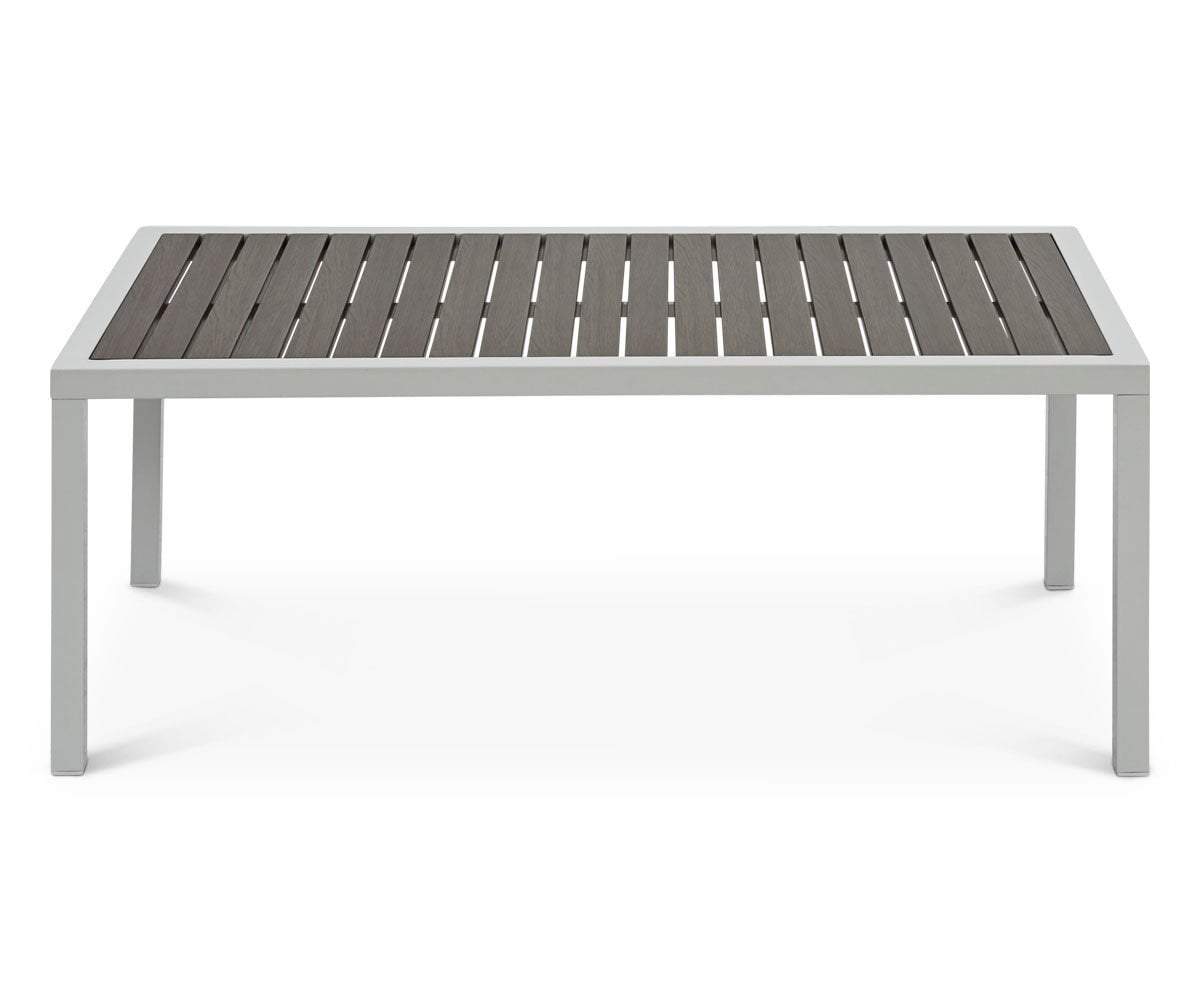 Modern in design, the Aurora coffee table is an attractive surface to place your refreshments, appetizers, plants, or decorative items. Featuring a white powder-coated aluminum frame with tabletop of resin wood slats, it is both durable and lightweight for enjoyment season after season.