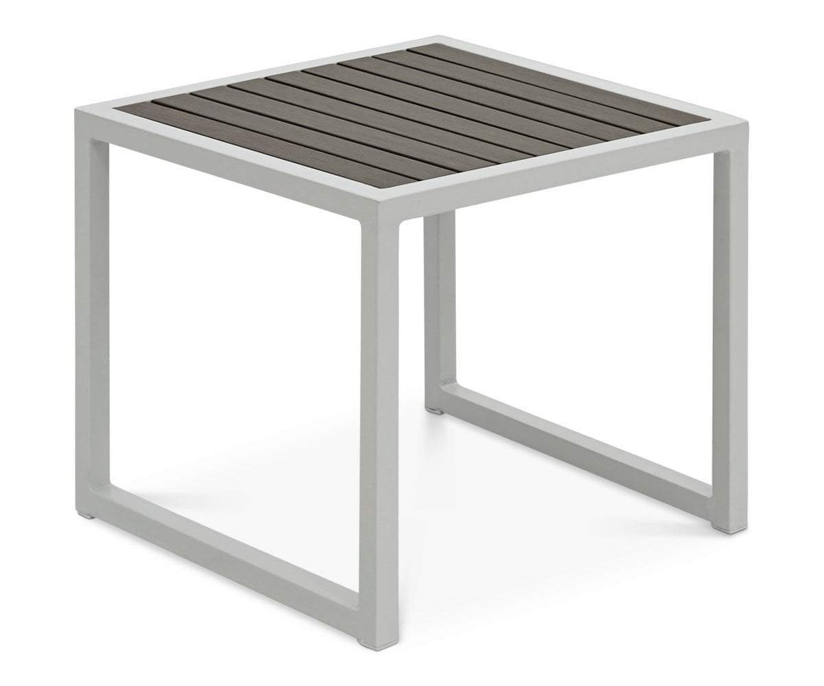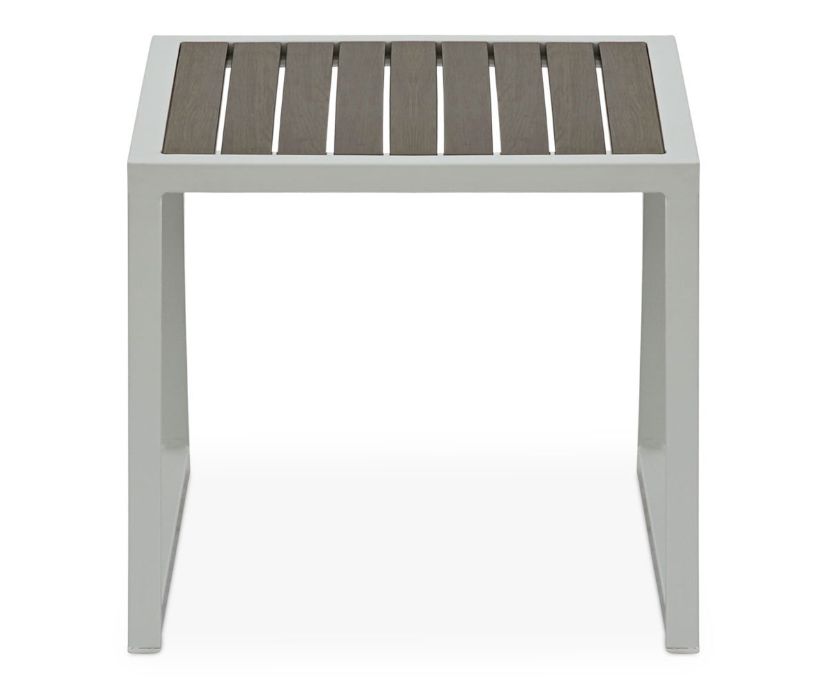 The Aurora end table features a white powder-coated aluminum frame with a tabletop of resin wood slats. Both durable and lightweight, it is designed for use season after season. This accent piece is large enough to serve multiple purposes, yet small enough to tuck into small spaces.